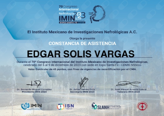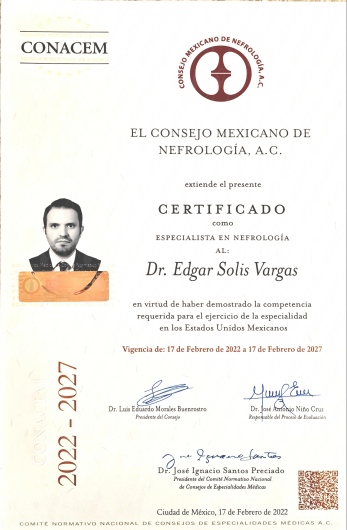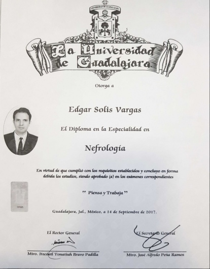 - 2014 - 2017 Médico Nefrólogo Titulado Universidad de Guadalajara Unidad Médica de Alta Especialidad. Centro Médico Nacional de Occidente, Instituto Mexicano del Seguro Social (IMSS). Cédula Federal 11282714 Certificado por el Consejo Mexicano de Nefrología 2017-2022