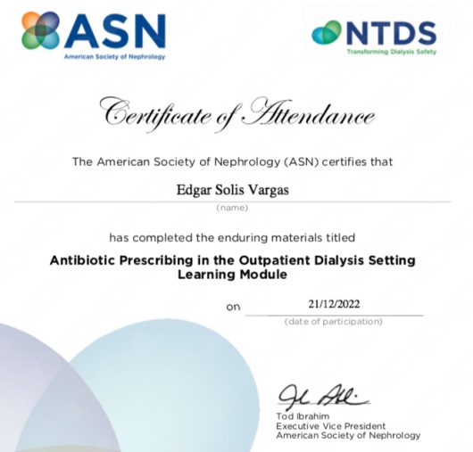 2018 Asistente: Kidney Week, American Society of Nephrology (ASN). 23 – 28 de Octubre, San Diego, California.